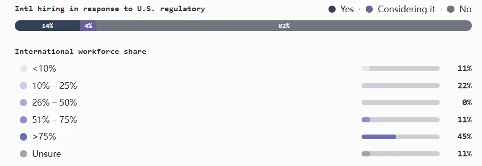- 近四分之一同时在美国和国外拥有员工的公司表示,监管直接促使其决定扩大国际招聘规模。