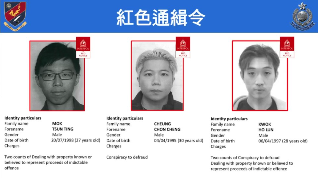 同日,国际刑事警察组织(Interpol)对 3 名逃犯发出红色通缉令,他们被指为主脑及核心成员,已逃往海外:27 岁的 Mok Tsun-ting(莫俊廷),30 岁的 Cheung Chon-cheong(张俊成),28 岁的 Kwok Ho-lun(郭浩伦)。警方表示 3 人主导资金转移和洗钱,已冻结其相关资产,红色通缉令要求全球成员国协助逮捕。目前 JPEX 案累计逮捕 80 人,受害者超 2700 人,损失 16 亿港元。