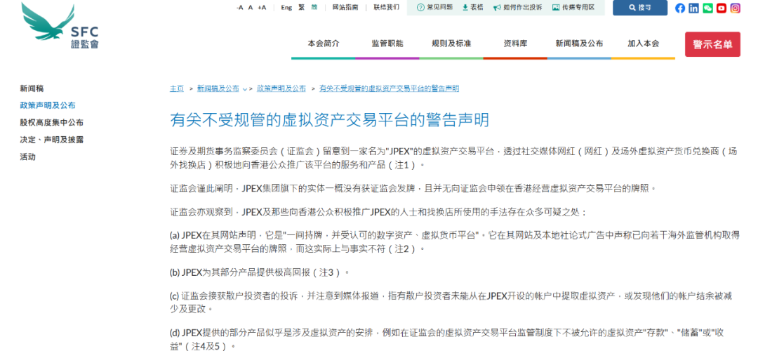 2023 年 9 月 13 日,香港证券及期货事务监察委员会(SFC)发布针对 JPEX 的公开警告声明,标题为 “关于不受监管的虚拟资产交易平台的警告声明”(Warning Statement on Unregulated Virtual Asset Trading Platform)。这份声明直指 JPEX 无牌运营,违反了 6 月 1 日生效的 VATP 许可制度,并点名其通过社交媒体影响者和 KOL(如 Instagram 上的推广帖)以及 OTC 店虚假宣传持有美国、加拿大、澳大利亚及迪拜 VARA 的金融牌照。SFC 调查显示,这些 “牌照” 实际仅限于外汇兑换服务,无法支持虚拟资产交易。声明强调,JPEX 自 2022 年 7 月 8 日就已被被列入证监会的警示名单,其产品如 Earn 服务承诺 ETH 年化 21%、BTC 20%、USDT 19% 的高回报涉嫌 “存款 / 收益” 安排,涉嫌非法集资,且众多散户投资者投诉无法提现或遭受损失。SFC 要求所有 KOL 和 OTC 店立即停止推广 JPEX 及其相关服务和产品。