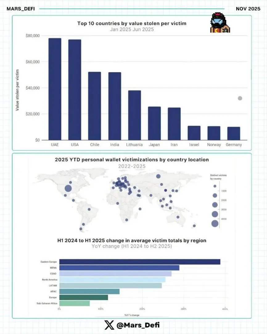 1)2025 年 1 月至 2025 年 6 月期间,每位受害者被盗金额最高的国家