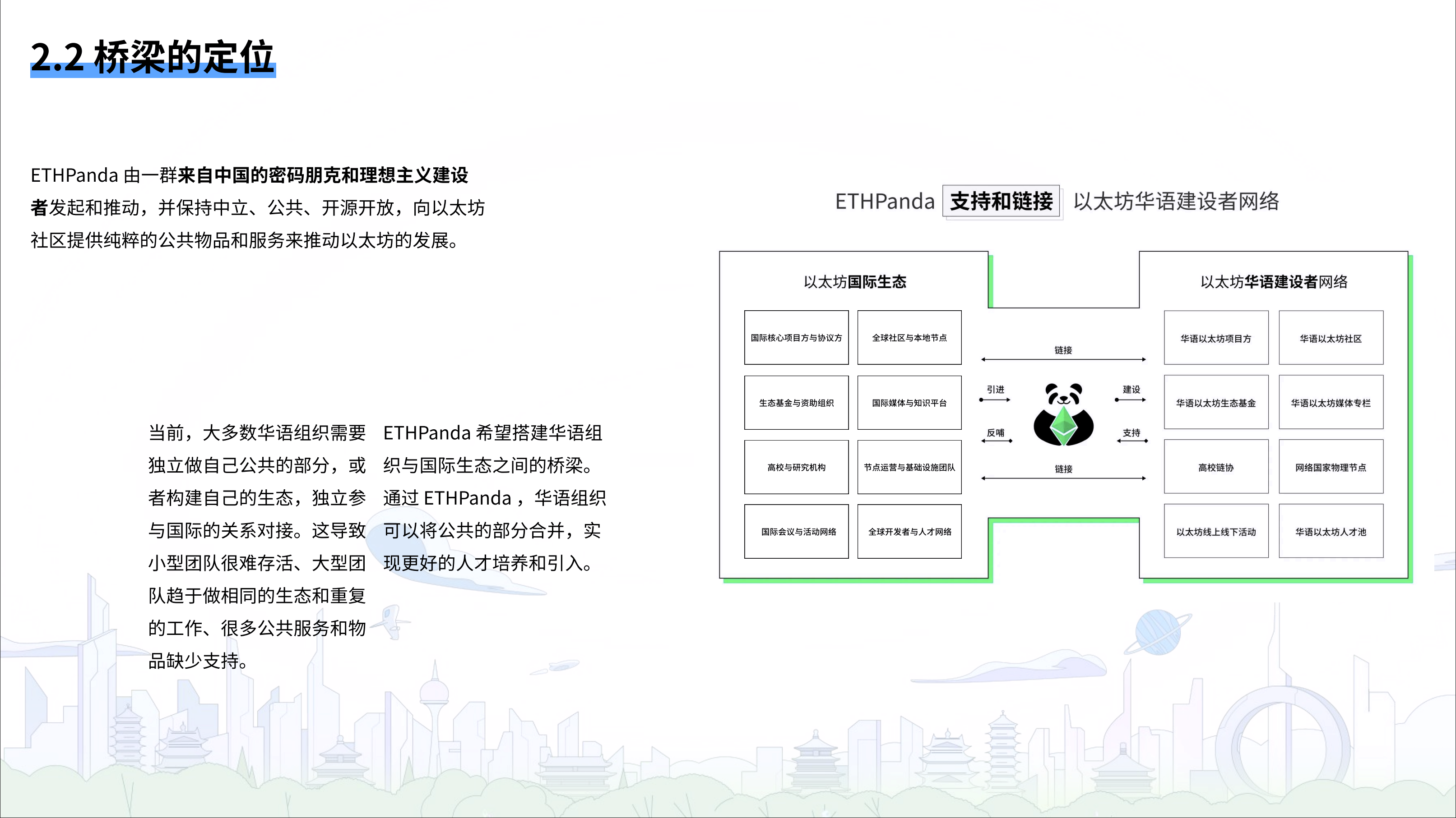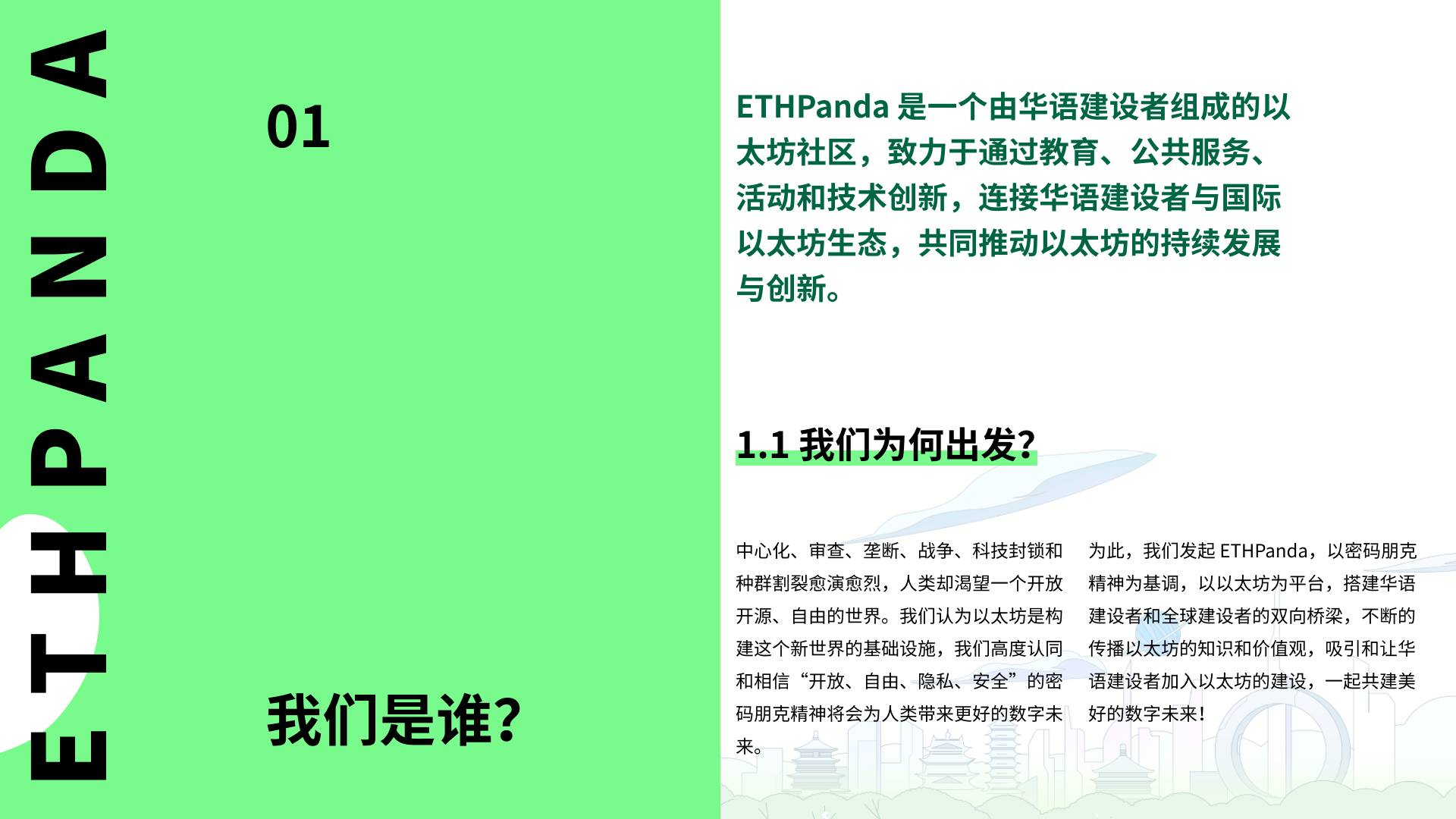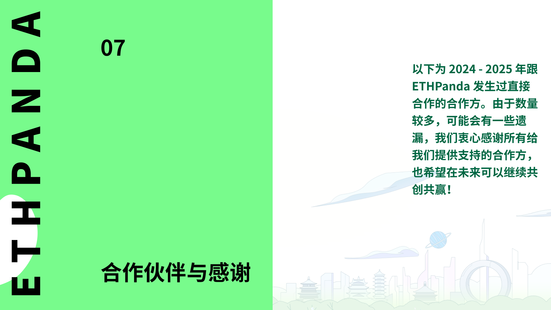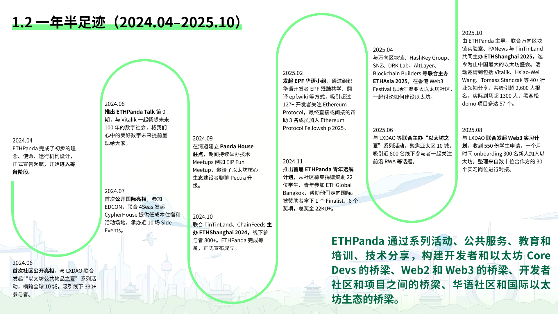 桥梁·建设·理想主义|ETHPanda 2024-2025年度报告 项目动态 2025-11-11 08:37:31 ETHPanda 是一个由华语建设者组成的以太坊社区,致力于通过教育、公共服务、活动和技术创新,连接华语建设者与国际以太坊生态,共同推动以太坊的持续发展与创新。 、