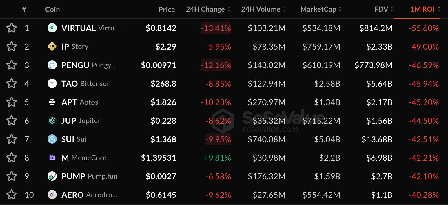 PANews 12月1日消息,据SoSoValue数据显示,过去1个月BTC下跌21.41%,ETH下跌26.68%。过去一个月内市值前100的加密货币中,有10个币种跌幅超过40%,其中: