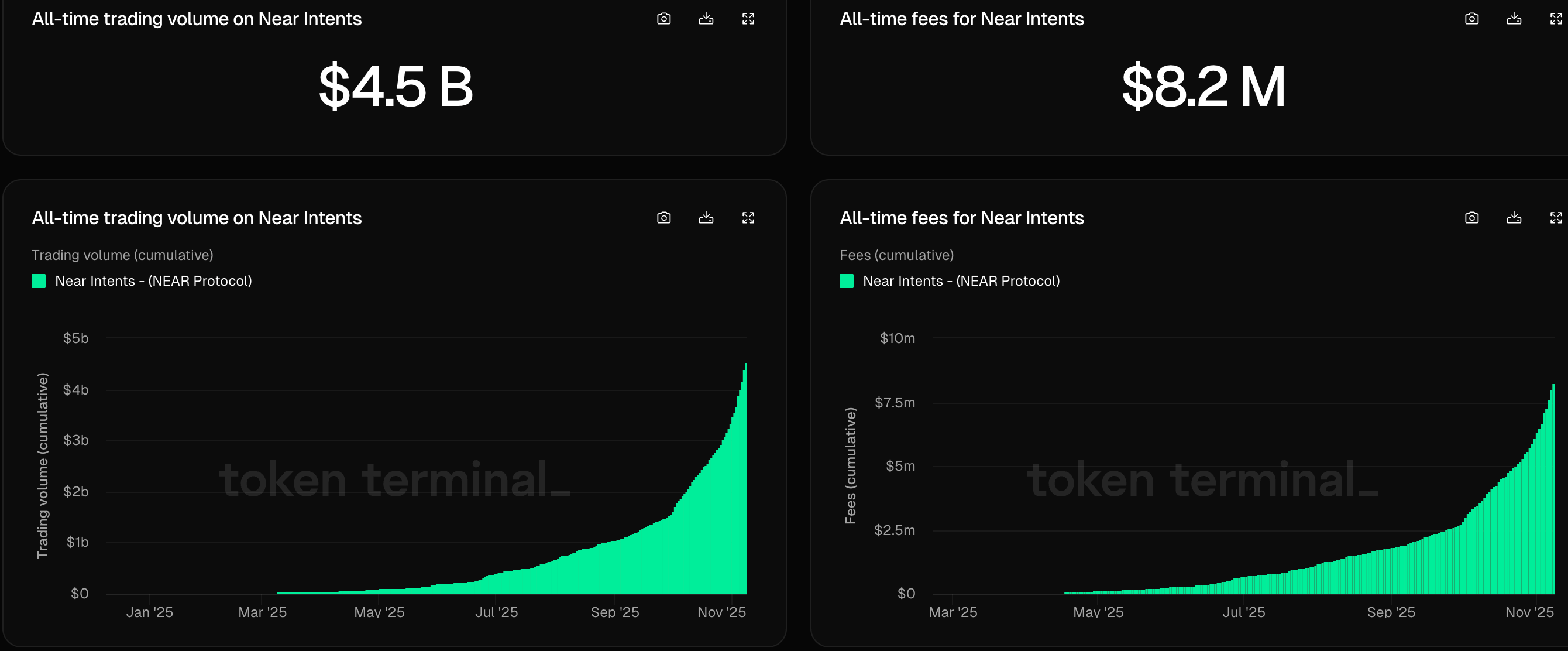 PANews 11月10日消息,据Token Terminal数据显示,NEAR Protocol的多链金融产品协议Near Intents累计交易量已达到45亿美元,累计费用达到820万美元,成为NEAR生态复苏的重要引擎。自2025年初以来,交易量和费用均呈现快速增长趋势。值得注意的是,近7日交易量为11亿美元,过去30天内Near Intents平台的月交易量达到了25亿美元。
