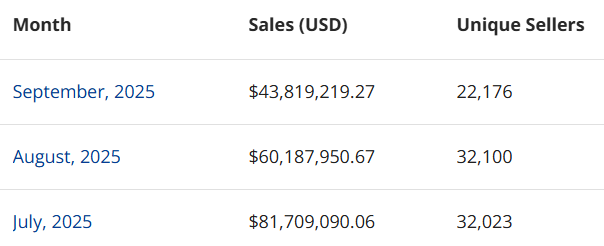 PANews 10月2日消息,据Cryptoslam数据显示,9月比特币链上NFT交易额约4381.92万美元,创下自2023年5月以来的最低单月交易额纪录。此外,9月以太坊链上NFT交易额约为1.76亿美元,创下2025年三季度最低单月交易额记录。