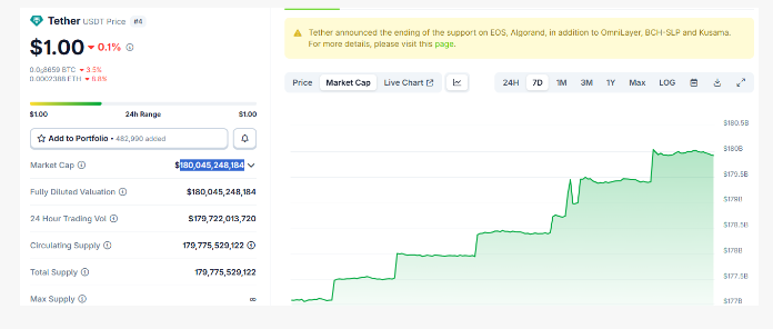 USDT市值突破1800亿美元续创新高,过去7天增长约30亿美元